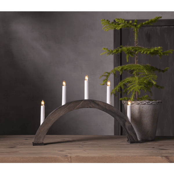 Elegant adventslysestage formet som en bue. Lavet af træ og bejdset med en valnøddebrun finish. Placer den enkle, men elegante lysestage i et vindue eller på en hylde. En gave til en dejlig julestemning. Leveres med 1,8 m hvid ledning, afbryder og stik. Inkluderer 5 udskiftelige E10-pærer (55V).