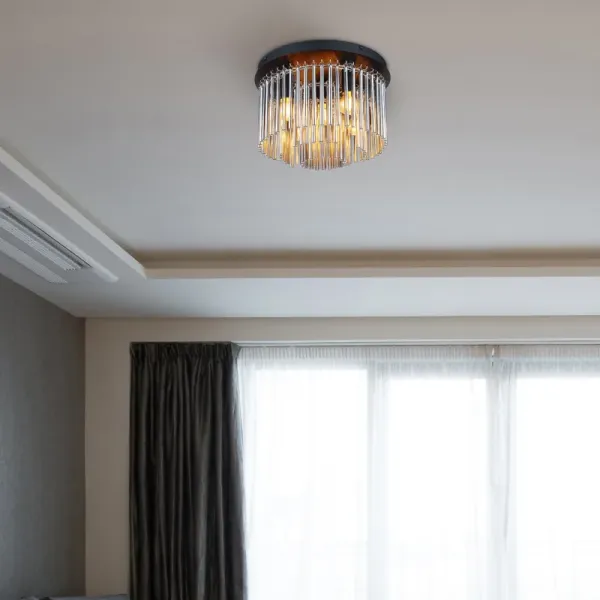 Gorley Ø32 Røgfarvet plafond Fra Globo Lighting - Dess design imponerar med en stilfull kombination av mattsvart metall, glänsande krom och rökfärgade glasstavar.