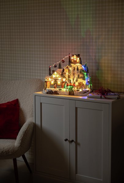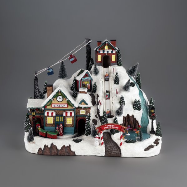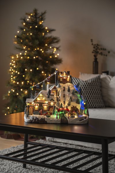 Skab en levende og magisk julestemning med denne detaljerede julelandsby formet som et skisportssted, lavet af polyresin. Det snedækkede miljø med station, skibakke og lift spreder en fantastisk vinterstemning. I alt 42 LED-dioder oplyser landsbyen i forskellige farver og skaber en stemningsfuld glød, mens de spiller musik for en ekstra festlig oplevelse. Julelandsbyen drives af 3 AA-batterier (medfølger ikke) og leveres også med et USB-kabel til brug med ledning (transformer medfølger ikke).