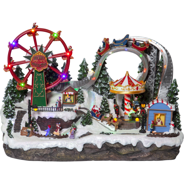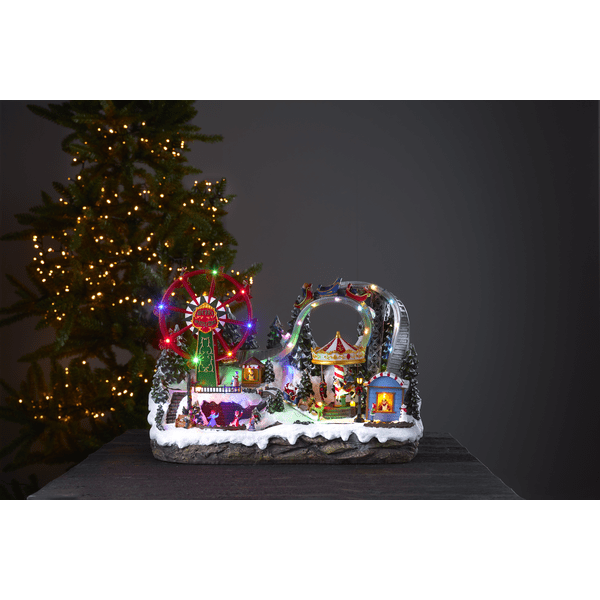 Stor og detaljeret dekorationslandsby i form af et tivoli med skøjtebane, karruseller og en bjergdal. De små lys skinner smukt i forskellige farver. Largeville tilbyder også musik, 8 sange med mulighed for at slukke for musikken og bevægelsen. Placer den på et skænk eller på et bord og skab en dejlig julestemning. Udstyret med timerfunktion, 6 timer tændt, 18 timer slukket, gentagelse. Leveres med ledning og stik og kan også drives af batteri, 3 AA-batterier (medfølger ikke). Brændetid ca. 48 timer ved brug af batterier.