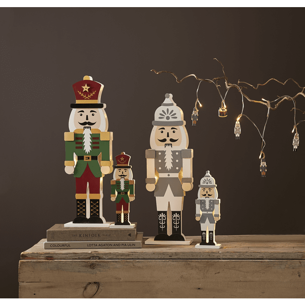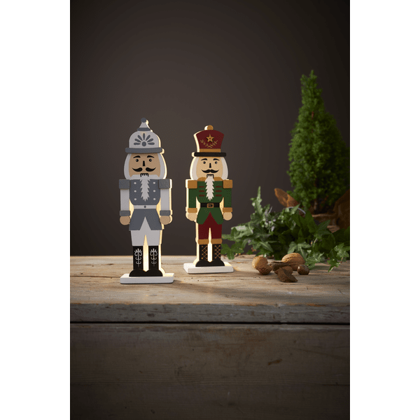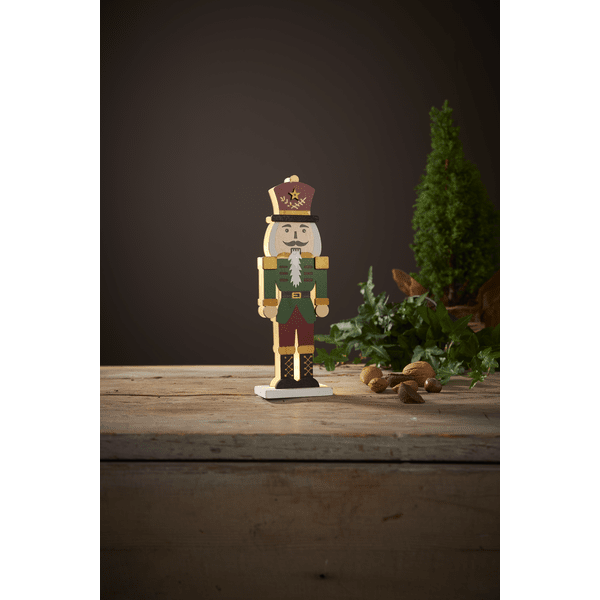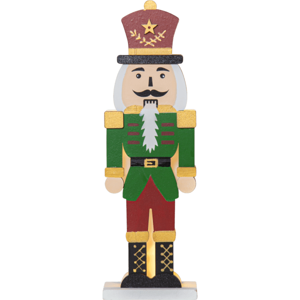 Stilfuld nøddeknækker i laserskåret træ, forsiden er malet i farverne rød, grøn, guld og sort. Små LED-lys lyser mellem de to puslespilsskårne silhuetter, en forside og en bagside. Pynt med nøddeknækkeren på et skrivebord eller en hylde til jul og advent. Udstyret med en timer, 6 timer tændt, 18 timer slukket, gentagende. Drevet af 2 AAA-batterier, medfølger ikke.