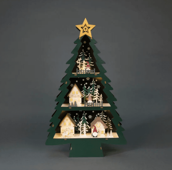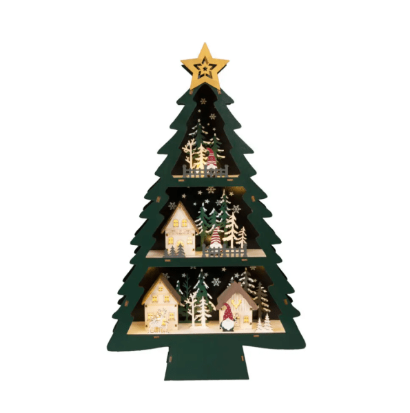 Smuk dekoration i form af et juletræ udelukkende lavet af træ. Indbygget integreret belysning i et varmt hvidt skær skaber en varm og hyggelig atmosfære i rummet. Drives af 2 AA-batterier (medfølger ikke) eller med det medfølgende USB-kabel. 180 cm. Træet er desuden udstyret med en timerfunktion på 6h.